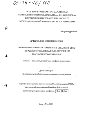 Представленная работа является одним из разделов комплексных исследований, проводимых в ВИЭВ по теме: подпроект 09, раздел 09.01, этап HI, подэтап HI а «Клинико-эпизоотологическая, патоморфологическая и серологическая характеристика медленных инфекций овец (висна-мэди, скрепи, аденоматоз) в неблагополучных хозяйствах».