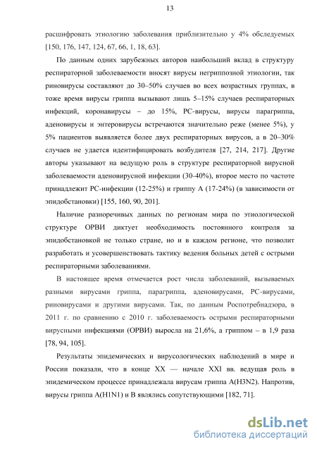 В литературе приводятся разноречивые данные по структуре основных респираторных вирусных заболеваний. Так, по данным отечественных авторов удельный вес вирусов гриппа составляет от 35 до 50%. В межэпидемический период заболеваемость гриппом снижается до 15–20%, вирусы парагриппа составляют от 4 до 35%, доля респираторно синцитиальных (РС) вирусов – от 8 до 20%, аденовирусов – 10 - 20%, а сочетание двух и более вирусов может составлять — 20-30%. Не удается расшифровать этиологию заболевания приблизительно у 4% обследуемых [150, 176, 147, 124, 67, 66, 1, 18, 63].