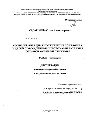 Публикации. По теме диссертации опубликовано 15 научных работ, 2 из них в научных журналах, рецензируемых ВАК РФ. Подготовлено пособие для врачей «Мониторинг врожденных пороков развития и ранняя диагностика пиелонефрита у детей» как часть общего пособия для врачей «Ранняя диагностика хронической болезни почек у детей». Получено удостоверение на рационализаторское предложение №1369 от 20.09.2010г. «Способ прогнозирования развития пиелонефрита у детей с аномалиями органов мочевой системы». Представлена заявка на изобретение «Способ прогнозирования развития пиелонефрита у детей с аномалиями органов мочевой системы» (получена приоритетная справка, регистрационный номер 2010143926 от 26.10.2010г.).