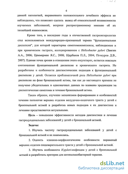 Кроме того, в последние годы в отечественной гастроэнтерологии стал использоваться международно-признанный термин “функциональная диспепсия”, для которой характерны симптомокомплексы, наблюдаемые и при хроническом гастрите, ассоциированном с H.pylori (Щербаков П.Л., 2004; Звягин А.А., 2006; Печкуров Д.В., 2007; Циммерман Я.С., 2008). Единая точка зрения в отношении этого отсутствует, остается неясным соотношение функциональной диспепсии и хронического гастрита у детей с бронхиальной астмой. Не разработаны и особенности диагностических подходов к функциональной диспепсии у детей. Остается проблематичной роль H.pylori при диспепсии, так как до настоящего времени не получено убедительных и однозначных данных по влиянию эрадикации на диспептические симптомы, не разработаны критерии проведения эрадикационной терапии H.pylori у детей с бронхиальной астмой.