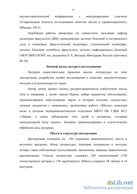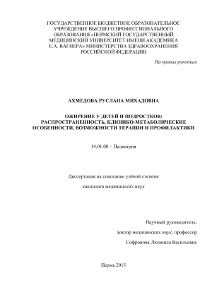Таким образом, результаты проведенного исследования свидетельствуют, об увеличении распространенности избыточной массы тела и ожирения среди детей 13-14 лет за последние 8 лет более чем в полтора раза. Установлено, что в 2014 году ожирение либо избыточная масса тела диагностировались у каждого пятого подростка. Определены предикторы развития ожирения, позволяющих выделить наиболее угрожаемых по развитию ожирения детей. В группу риска формирования ожирения следует отнести детей с отягощенной наследственностью по ожирению и СД 2 типа; детей с массой тела при рождении более 4 кг; а также младенцев, находящихся на искусственном вскармливании, рано получивших прикорм и имеющих большие прибавки массы тела, особенно во втором полугодии первого года жизни. Для диагностики избыточной массы тела у мальчиков пубертатного возраста рекомендовано проводить биоимпедансное исследование с целью определения массы жировой ткани. Показано, что стандартная терапия ожирения у детей и подростков не дает желаемых результатов. Применение комплексного лечения, включающего обучение в «Школе снижения веса» и медикаментозное лечение метформином в терапии ожирения с доказанной инсулинорезистентностью способствует улучшению и нормализации метаболических показателей. У детей, получавших стандартное лечение, помимо отсутствия снижения SDS ИМТ, через 12 месяцев наблюдения отмечалось ухудшение показателей углеводного и жирового обмена.