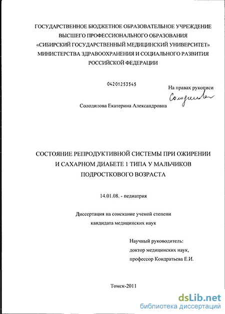 Актуальность проблемы. XXI век - век технического прогресса, нанотехнологий, развития фундаментальных наук медицины. Эти достижения призваны решать ряд актуальных медико-социальных проблем. Среди них такие распространенные заболевания как сахарный диабет, ожирение, метаболический синдром. Данные заболевания имеют высокий риск развития многочисленных метаболических, функциональных и органических нарушений, среди которых, прежде всего, микро- и макрососудистые осложнения, часто вызывающие инвалидизацию организма [Дедов И.И., 2006, Аметов А.С., 2009, Cook S., 2003]. По статистике ВОЗ в 45% случаев причиной бесплодных браков является мужское бесплодие. В связи с этим своевременное выявление патологических тенденций в состоянии здоровья подростка и их адекватная коррекция способны существенно повлиять на состояние здоровья во взрослой жизни, выбор профессии, благоприятную социальную адаптацию [Мирский В.Е, 2008, Строев Ю.И., 2004]. Число заболеваний, прямо или опосредованно влияющих на органы репродукции мужчин, неуклонно растет [Тиктинский, 2010]. Нарушениям репродуктивной системы у мужчин с ожирением и сахарным диабетом 1 типа (СД 1 типа) придается большое значение [Калинченко С.Ю., 2009]. Одной из важнейших характеристик подросткового возраста является половое развитие. Отмечается тенденция к более позднему и часто неправильному развитию пубертата у мальчиков-подростков с ожирением [Дедов И.И., 2006]. Секреция андрогенов также часто нарушена у мальчиков с сахарным диабетом 1 типа [Петеркова В.А., 2006]. В связи с этим очень важно для оценки состояния здоровья любого подростка, в том числе с ожирением и сахарным диабетом, определение характеристик полового развития, что весьма актуально для сохранения репродуктивного потенциала нации [Дедов И.И., Петеркова В.А. 2002].