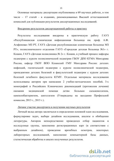 «Республиканская клиническая инфекционная больница им. проф. А.Ф. Агафонова» МЗ РТ, ГАУЗ «Детская республиканская клиническая больница МЗ РТ», поликлинического отделения ГАУЗ «Городская детская больница №1» г. Казани, ГАУЗ «Детская поликлиника № 2» г. Казани, в учебный процесс кафедры педиатрии с курсом поликлинической педиатрии ГБОУ ДПО КГМА Минздрава России, кафедр ГБОУ ВПО Казанский ГМУ Минздрава России: детских инфекций, госпитальной педиатрии с курсом поликлинической педиатрии, пропедевтики детских болезней и факультетской педиатрии с курсом детских болезней лечебного факультета КГМУ. Отдельные материалы исследования использованы автором при написании 2 учебно-методических пособий, 3-х монографий и Российских Клинических рекомендаций (протоколов лечения) оказания медицинской помощи детям больным сальмонеллезом, кампилобактериозом, шигеллезом (Утверждены на заседании Профильной комиссии, 2013 г., 2015 г.).