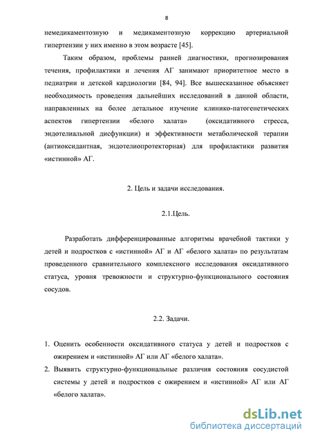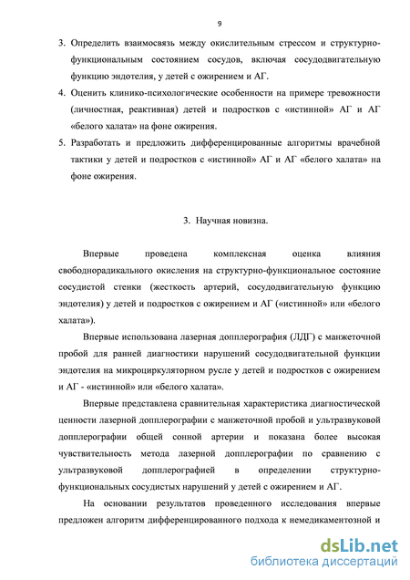 На заключительном этапе (VI этап) проводилась оценка эффективности метаболической терапии (таурин) в лечении и профилактике окислительного стресса и эндотелиальной дисфункции у обследованных детей и подростков. Таким образом, используемые в работе методы исследования позволяют выявить метаболические и структурно-функциональные изменения со стороны циркуляторного русла на раннем этапе, то есть до формирования необратимых структурных изменений со стороны сосудов у детей подросткового возраста с ожирением и АГ. Это особенно важно для проведения своевременных профилактических мероприятий у детей с ожирением и АГ «белого халата», которые входят в группу высокого риска по формированию «истинной» АГ. ГЛАВА 3. СОБСТВЕННЫЕ ИССЛЕДОВАНИЯ