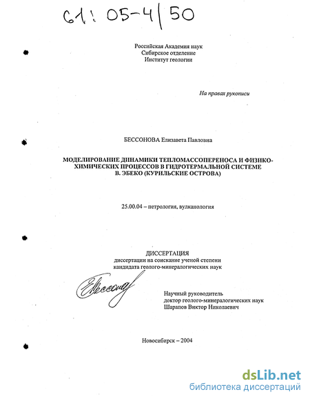 разгрузки гидротермальной системы активного андезитового вулкана, составе вулканических и гидротермально измененных пород были которые были собраны в процессе полевых исследований на вулкане Эбеко (о. Парамушир, Северные Курилы) в течении экспедиций Института Геологии ОИГГМ СО РАН и Института вулканологии ДВО РАН 1997-2004 гг. при участии автора. В работе также обобщены опубликованные данные о геологии, гидрогеологии и термальных водах о-ва Парамушир.