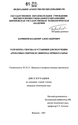 Из представленного информационного материала видно, что научно-исследовательские работы в области получения ароматных спиртов не проводились уже около 40 лет и в настоящее время ароматные спирты получают по устаревшим технологиям, которые в условиях рыночной экономики имеют ряд недостатков, таких как: - низкая степень извлечения эфирного масла из эфиромасличного сырья, которая на данный момент находится в пределах 70...75 % и отсутствие возможности ее повысить, хотя при затратах на эфиромасличное сырье составляющих 50 % и более от общей себестоимости ароматного спирта это позволило бы значительно уменьшить себестоимость последнего; - большая общая продолжительность процесса (6...8 ч) и отсутствие возможности ее снизить, что ограничивает ассортимент ликероводочной продукции и не позволяет увеличить его в сторону особых водок и настоек, в рецептуре которых предусмотрены ароматные спирты; поэтому заводам для увеличения мощности цеха ароматных спиртов, приходится покупать новые установки, так как действующие не обеспечивают данной возможности; - нестабильность качества ароматных спиртов: одни и те же виды аро матных спиртов получаются с различным содержанием эфирных масел. Кроме того, нет математической модели процесса получения ароматного спирта и не обобщены основные факторы, влияющие на его протекание Исходя из вышеизложенного, сформулирована цель диссертационной работы: исследование процесса получения ароматного спирта из эфиромас-личного сырья, его совершенствование, а так же разработка новых способов и оборудования для его осуществления. В связи с этим задачи настоящей работы можно сформулировать следующим образом: - разработка новой установки для получения ароматного спирта; - исследование возможности повышения степени извлечения эфирного масла из эфиромасличного сырья при получении ароматного спирта на разработанной установке; - исследование возможности снижения продолжительности процесса получения ароматного спирта на разработанной установке; - исследование возможности повышения стабильности качества ароматных спиртов и ликероводочных изделий, в рецептуре которых предусмотрено их использование; - разработка способа автоматического управления процессом подвода теплоты и охлаждающей воды при получении ароматных спиртов; - разработка математической модели процесса получения ароматного спирта; - обобщение основных факторов, влияющих на процесс получения ароматного спирта; - определение эффективности предлагаемых разработок. Последующие главы данной диссертационной работы посвящены ре шению поставленных задач.