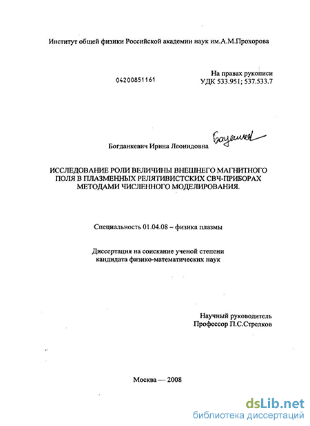 в исстедовании методами численного моделирования физических процессов, проходящих в плаз\іеппо-п}чковой системе плазменных релятивистских СВЧ-приборов с учетом конечного внешнего магнитного поля,