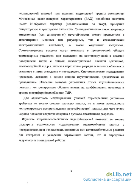 такта имеет N-образный характер (неоднозначный по току), присущий генераторным и триггерным элементам. Экспериментально такая вторично-эмиссионная (или динатронная) неустойчивость может проявляться в автогенерации мощных как регулярных, так и стохастических электромагнитных колебаний, а также отдельных импульсов. Соответствующие условия могут возникать в пристеночной области термоядерных установок, при появлении на контактирующей с плазмой поверхности пятен с тонкой диэлектрической пленкой (оксидной, алмазоподобной и д.р.), вызывая паразитные разряды в теневых областях и связанное с ними осаждение углеводородов. Систематические исследования процессов, лежащих в основе данной неустойчивости, практически не проводились. Освоение методов управления этими неустойчивостями позволит контролируемым образом влиять на коэффициенты переноса и эрозию в периферийных областях ТЯР.