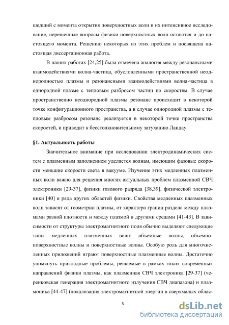 Значительное внимание при исследовании электродинамических систем с плазменным заполнением уделяется волнам, имеющим фазовые скорости меньшие скорости света в вакууме. Изучение этих медленных плазменных волн важно для решения многих актуальных проблем плазменной СВЧ электроники, физики газового разряда, физической электроники и ряда других областей физики. Свойства медленных плазменных волн зависят от геометрии плазмы, от характера границ раздела между плазмами разной плотности и между плазмой и другими средами. В зависимости от структуры электромагнитного поля обычно выделяют следующие типы медленных плазменных волн: объемные волны, объемно-поверхностные волны и поверхностные волны [1]. Особую роль для многочисленных приложений играют поверхностные плазменные волны. Достаточно упомянуть прикладные проблемы, решаемые в рамках таких современных направлений физики плазмы, как плазменная СВЧ электроника [2] (черенковская генерация электромагнитного излучения СВЧ диапазона) и плазмоника [3] (локализация электромагнитной энергии в сверхмалых областях пространства). Этим проблемам, а значит и исследованию поверхностных волн в плазме, в последнее время уделяется особо большое внимание, чем и определяется актуальность темы диссертации, посвященной исследованию поверхностных волн в различных плазменных электродинамических системах.