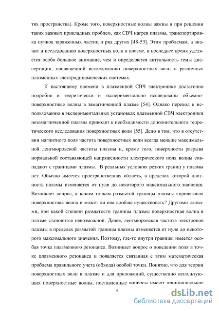 К настоящему времени в плазменной СВЧ электронике достаточно подробно и теоретически и экспериментально исследованы объемно-поверхностные волны в замагниченной плазме [4]. Однако переход к использованию в экспериментальных установках плазменной СВЧ электроники неза-магниченной плазмы приводит к необходимости дополнительного теоретического исследования поверхностных волн [5]. Дело в том, что в отсутствии магнитного поля частота поверхностных волн всегда меньше максимальной лен-гмюровской частоты плазмы и, кроме того, поверхности разрыва нормальной составляющей напряженности электрического поля волны совпадают с границами плазмы. В реальных условиях резких границ у плазмы нет. Обычно имеется пространственная область, в пределах которой плотность плазмы изменяется от нуля до некоторого максимального значения. Возникает вопрос, к каким точкам размытой границы плазмы «привязана» поверхностная волна и может ли она вообще существовать? Другими словами, при какой степени размытости границы плазмы поверхностная волна в плазме становится невозможной. Далее, ленгмюровская частота электронов плазмы в пределах размытой границы плазмы изменяется от нуля до некоторого максимального значения. Поэтому, где-то внутри границы имеется особая точка плазменного резонанса. Возникает вопрос о поведении поля в точке плазменного резонанса и появляется связанная с этим математическая проблема правильного учета (обхода) особой точки. Понятно, что для теории поверхностных волн в плазме и для приложений, существенно использующих поверхностные волны, поставленные вопросы имеют принципиальное значение. Ответ на поставленные вопросы, чему в значительной мере посвящена настоящая диссертационная работа, принципиален для физики поверхностных волн в плазме и чрезвычайно актуален для современных прикладных исследований, использующих поверхностные волны в плазме.