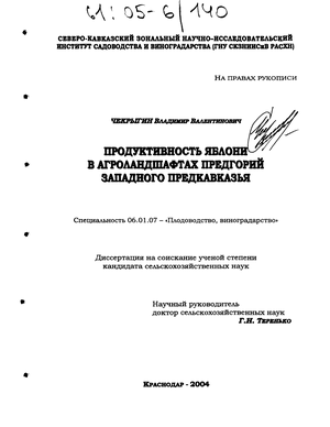 На изучение продуктивности яблони в агроландшафтах предгорий направлена данная работа; исследования проводились в 2001-2004 годах на склонах Западного Предкавказья, где климатические условия оптимальны для садоводства, что подтверждает полувековой период становления и развития КСП «Светлогорское» Абинского района Краснодарского края. Работа выполнена в соответствии с планом НИР СКЗНИИСиВ, номер государственной регистрации 01200309465.