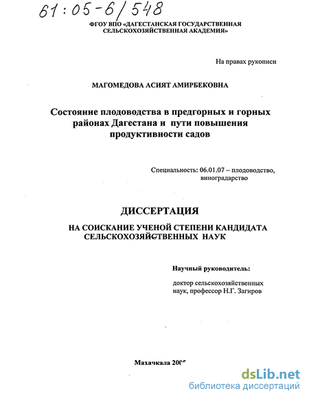 Автор выражает глубокую благодарность за помощь и поддержку в выполнении данной работы научному руководителю-заведующему кафедрой плодоводства и ботаники, доктору сельскохозяйственных наук, академику МАВиВ, лауреату Международной премии и Государственной премии Республики Дагестан, профессору Н.Г. Загирову и всем сотрудникам кафедры плодоводства и ботаники ДГСХА.