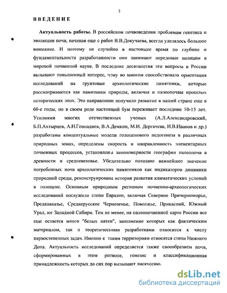 Актуальность работы. В российском почвоведении проблемам генезиса и эволюции почв, начиная еще с работ В.В.Докучаева, всегда уделялось большое внимание. И поэтому не случайно в настоящее время по глубине и фундаментальности разработанности они занимают передовые позиции в мировой почвенной науке. В последние десятилетия эти вопросы в России вызывают повышенный интерес, чему во многом способствовала ориентация исследований на фунтовые археологические памятники, которые рассматриваются как памятники природы, включая и палеопочвы прошлых исторических эпох. Усилиями многих отечественных ученых (АЛ.Александровский, Б.П.Ахтырцев, А. Н.Геннадиев, В.А.Демкин, М.И. Дергачева, И.В.Иванов и др.) разработаны концептуальные модели голоценового педогенеза в различных природных зонах, определены скорость и направленность элементарных почвенных процессов, установлены закономерности географии палеопочв в древности и средневековье. Убедительно показано важнейшее значение погребенных почв археологических памятников как индикаторов динамики природной среды, реконструирована история развития климатических условий в голоцене. Тем не менее, на палеопочвенной карте России все еще остается много "белых пятен", заполнение которых как фактическим материалом, так и теоретическими разработками относится к числу первостепенных задач. Именно к таким территориям относятся степи Нижнего Дона. Актуальность исследований определяется также своеобразием почв, сформированных в этом регионе, генезис и классификационная принадлежность которых до сих пор вызывают дискуссию.