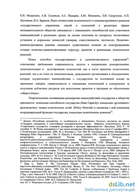Выступление В. Суркова «Модернизация: материальный ресурс свободы» на конференции «Социальное измерение модернизации». М. 29 сентября 2010 г. Сайт Президента Российской Федерации - http://state.kremlin.ru/administration/918 практик «неучастия» в проектах власти, заложенных неисполнением обязательств государством, малой результативностью осуществленных масштабных социальных проектов (монетизация льгот, реформирование системы здравоохранения, пенсионная реформа). Авторы доклада Русского института «Российская демократия: от устойчивости к обновлению» пишут, что «система ищет защиту не столько от шаблонных безумств толпы, сколько от шаблонных ошибок и преступлений исполнительной власти»303. Какой институт, помимо государства способен мобилизовать нацию на развитие экономико-технологического потенциала и конкурентоспособности, реализуя свои социальные способности, обеспечивая стабильность власти и ее эффективность, определяя правила игры и контролируя их соблюдение, поддерживая уровень образования и технической компетенции, выполняя крупные проекты и управляя крупномасштабными производствами, формируя для их осуществления финансовые рынки и институты, способные привлечь инвестиции, создавая условия для «выгодности» повышения уровня «честности» государственных и частных институтов и роста доверия к ним . Бюрократия, государство должны стать иными, выполняя базовые функции на основе веберовских принципов компетентности, беспристрастности, достойном вознаграждении труда, обеспечивая безопасность граждан и страны, предоставляя услуги гражданам на принципах равенства и справедливости.