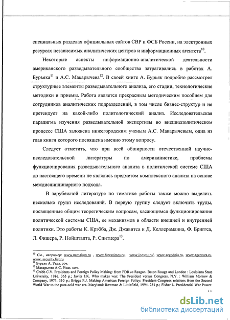 Фундаментальные труды российских ученых, посвященные рассмотрению процесса формирования внешнеполитического курса США, а также анализу теоретических аспектов национальной безопасности США, послужили исходной базой для разработки и изучения конкретной тематики разведывательно-аналитического механизма. В данном ключе следует назвать работы Г.А. Арбатова, Э.Я. Баталова, А.М. Белоногова, А.Д. Богатурова, А.А. Громыко, Н.В. Загладина, Ю.А. Иванова, А.А. Кокошина, Н.А. Косолапова, И.Н. Панарина, С. М. Рогова, В.А. Савельева, О.О. Хохлышевой, П.А. Цыганкова, Б.А. Шмелева и других.