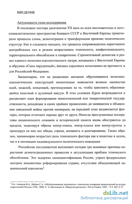 Российские исследователи вычленяют сегодня три основные причины нарастания дезинтеграционных процессов и актуализации проблем этнического обособления. Это задержка самоидентификации России, утрата федеральным центром инициативы реформирования страны, отсутствие объединяющей национальной идеологии1. ' См.: Ачкасов В.А., Бабаев С.А. «Мобилизованная этничность»: этническое измерение политической культуры современной России. СПб., 2000. С. 4; Магомедов А. Общества регионов // Pro et Contra, 1997. - Т.2, №2, С.51