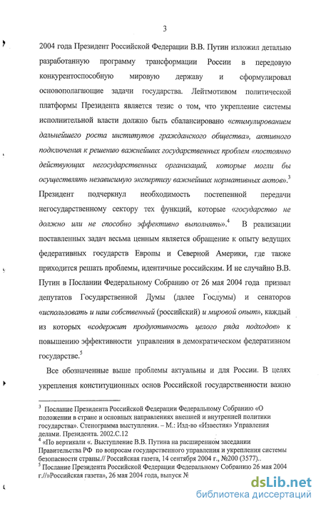2004 года Президент Российской Федерации В.В. Путин изложил детально разработанную программу трансформации России в передовую конкурентоспособную мировую державу и сформулировал основополагающие задачи государства. Лейтмотивом политической платформы Президента является тезис о том, что укрепление системы исполнительной власти должно быть сбалансировано «стимулированием дальнейшего роста институтов гражданского общества», активного подключения к решению важнейших государственных проблем «постоянно действующих негосударственных организаций, которые могли бы осуществлять независимую экспертизу важнейших нормативных актов».3 Президент подчеркнул необходимость постепенной передачи негосударственному сектору тех функций, которые «государство не должно или не способно эффективно выполнять». В реализации поставленных задач весьма ценным является обращение к опыту ведущих федеративных государств Европы и Северной Америки, где также приходится решать проблемы, идентичные российским. И не случайно В.В. Путин в Послании Федеральному Собранию от 26 мая 2004 года призвал депутатов Государственной Думы (далее Госдумы) и сенаторов «использовать и наш собственный (российский) и мировой опыт», каждый из которых «содержит продуктивность целого ряда подходов» к повышению эффективности управления в демократическом федеративном государстве.