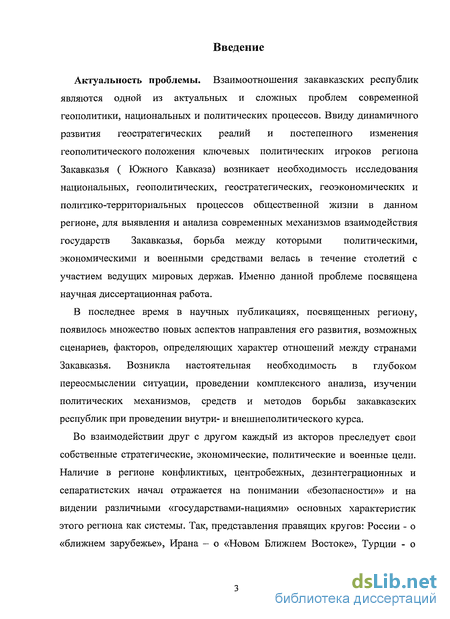 Актуальность проблемы. Взаимоотношения закавказских республик являются одной из актуальных и сложных проблем современной геополитики, национальных и политических процессов. Ввиду динамичного развития геостратегических реалий и постепенного изменения геополитического положения ключевых политических игроков региона Закавказья ( Южного Кавказа) возникает необходимость исследования национальных, геополитических, геостратегических, геоэкономических и политико-территориальных процессов общественной жизни в данном регионе, для выявления и анализа современных механизмов взаимодействия государств Закавказья, борьба между которыми политическими, экономическими и военными средствами велась в течение столетий с участием ведущих мировых держав. Именно данной проблеме посвящена научная диссертационная работа.