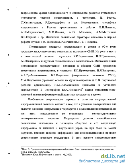 Белл Д. Грядущее постиндустриальное общество. Опыт социального прогнозирования. Пер. с англ. М., 1999. С.632. 9 Нисневич Ю.А. Информация и власть. М, 2000.