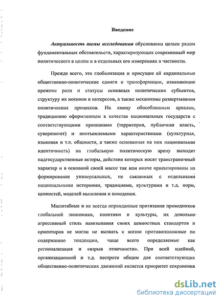 Прежде всего, это глобализация и присущие ей кардинальные общественно-политические сдвиги и транс формации, изменяющие прежние роли и статусы основных политических субъектов, структуру их мотивов и интересов, а также механизмы развертывания политических процессов. На смену обособленным ареалам, традиционно оформленным в качестве национальных государств с соответствующими признаками (территория, публичная власть, суверенитет) и неотъемлемыми характеристиками (культурная, языковая и т.п. общности, а также основанная на них нащюнальная иденпганость) на глобальную политическую арену выходят надгосударственные акторы, действия которых носят трансграничный характер и в основной своей массе так или иначе ориентированы на формирование универсальных, не связанных с отдельными национальными историями, традициями, культурами и т.д. норм, ценностей, моделей мышления и поведения.