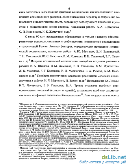 С конца 90-х гг. исследователи обращаются не только к анализу общетеоретических вопросов, связанных с особенностями политической социализации в современной России. Анализу факторов, определяющих протекание политической социализации, посвящены работы А. Ю. Мельвиля, Е. И. Башкировой, Т. Н. Самсоновой, Ю. С. Васютина, В. М. Хомякова, Е. Н. Савиновой, 3. Г. Галее-ва и др. Вопросы политической социализации молодёжи получили развитие в работах И. А. Щеглова, В. М. Хомякова, В. В. Касьянова, Б. М. Ирисметова, Ж. К. Маканова, К. Г. Колтакова, И. И. Москвичёва, В. А. Рыкова, А. М. Ново-