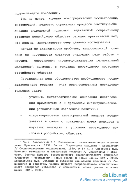 уточнить методологические основания исследования применительно к процессам институционализации региональной молодежной политики; охарактеризовать категориальный аппарат исследования в связи с появлением новых подходов к изучению молодежи в условиях переходного состояния российского общества;