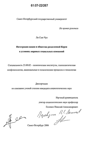 Структура диссертации. Диссертация состоит из пяти глав. В 1 и 2 главах формулируется проблема и теоретические основы исследования. В главе 3 анализируется опыт объединения и интеграции обществ с разным социальным и политическим строем с учетом внешнеполитической ситуации. В главе 4 исследуется национализм в Северной и Южной Корее. В главе 5 на основе полученных ранее выводов и обобщений формулируется концепция объединения и интеграция страны. В заключении подводятся итоги работы.