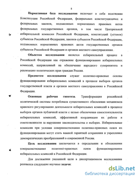 Основная рабочая гипотеза. Трансформация российской политической системы потребовала существенного обновления механизмов правового регулирования деятельности избирательных комиссий в процессе выборов органов публичной власти с целью обеспечения самостоятельности избирательных комиссий, эффективной координации их работы и ответственности за нарушение законодательства о выборах. Избирательные комиссии при условии совершенствования политико-правовых основ их функционирования могут стать важной гарантией сохранения и укрепления демократических преобразований в современной России.