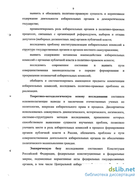 Теоретико-методологическую основу исследования составили основополагающие выводы и заключения отечественных ученых по политологии, вопросам избирательного права и процесса. Диссертантом использовалась совокупность диалектического, исторического, логического, системно-структурного методов исследования, применение которых способствовало выявлению сущности изучаемых проблем, позволило уточнить место и роль избирательных комиссий в процессе формирования органов публичной власти в России, обозначить проблемы и пути совершенствования деятельности избирательных органов по обеспечению политического волеизъявления граждан.