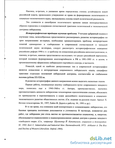 Историографическая традиция изучения проблемы. Учитывая избранный подход к изучению темы, целесообразным представляется рассматривать развитие историографии по трем направлениям: во-первых, необходимо проанализировать проблему интерпретации понятий «демократия» и «либерализм» в современной отечественной и западной политической науке; во-вторых, следует рассмотреть историографическое освещение российских реформ 1990-х гг. и проблему их осмысления российским интеллектуализмом; и, наконец, в-третьих, важным представляется исследовать тот раздел российской партологии, который посвящен формированию многопартийности в РФ в 1991-1993 гг. в целом, и организационному оформлению либерального партийного спектра, в частности.