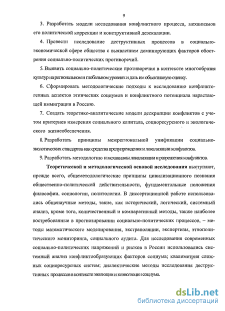 Теоретической и методологической основой исследования выступают, прежде всего, общеметодологические принципы цивилизационного познания общественно-политической действительности, фундаментальные положения философии, социологии, политологии. В диссертационной работе использовались общенаучные методы, такие, как исторический, логический, системный анализ, кроме того, количественный и компаративный методы, также наиболее востребованные в прогнозировании социально-политических процессов, — методы математического моделирования, экстраполяции, экспертизы, этнополи-тического мониторинга, социального аудита. Для исследования современных социально-политических напряжений и рисков в России использовались системный анализ конфликтообразующих факторов социума; квалиметрия сложных социоресурсных систем; диалектические методы исследования деструктивных процессов в контексте эволюции и коэволюции социума