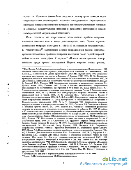 Стоит отметить, что теоретическое исследование проблем миграции населения началось еще в конце девятнадцатого века. Первое научное определение миграции было дано в 1885-1889 гг. западным исследователем Е. Равенштейном17, заложившим основы миграционной теории. Наиболее ярким исследованием проблемы миграции населения после Первой мировой войны является монография X. Арендт «Истоки тоталитаризма». Автор выделяет среди прочих последствий Первой мировой войны распад