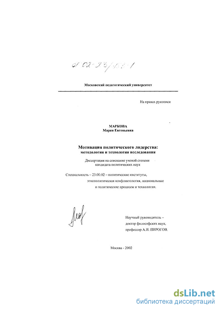 Маркова Мария Евгеньевна. Мотивация политического лидерства: методология и технология исследования : диссертация ... кандидата политических наук : 23.00.02.- Москва, 2002.- 194 с.: ил. РГБ ОД, 61 02-23/183-1