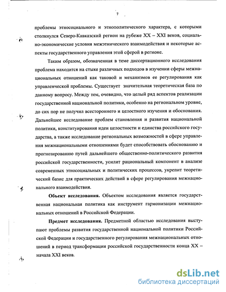 Предмет исследования. Предметной областью исследования выступают проблемы развития государственной национальной политики Российской Федерации и государственного регулирования межнациональных отношений в период трансформации российской государственности конца XX -начала XXI веков.