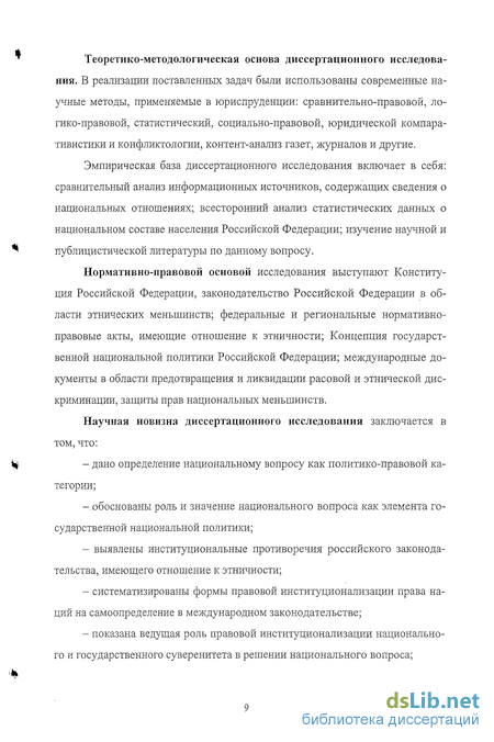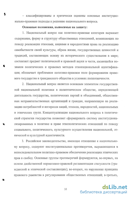 Тем не менее, институционально-правовой подход в этих работах не получил достаточного развития. Поэтому национальный вопрос требует специальной институциональной интерпретации, что может сыграть важную роль в формировании адекватной системы политико-правового регулирования этнокультурной сферы в российском варианте.