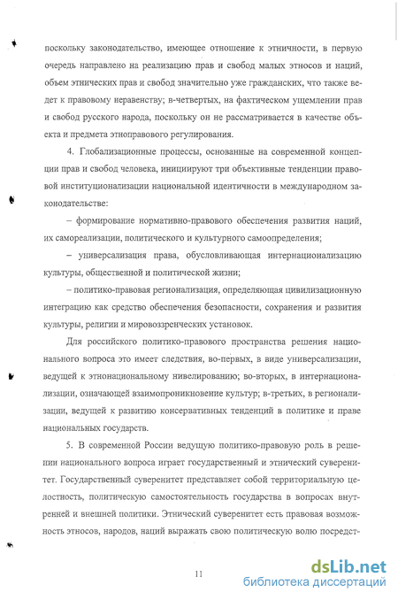 вторых, это ведет к нарушению принципа правового равенства в регулировании общественных отношений; в-третьих, поскольку законодательство, имеющее отношение к этничности, в первую очередь направлено на реализацию прав и свобод малых этносов и наций, объем этнических прав и свобод значительно уже гражданских, что также ведет к правовому неравенству; в-четвертых, данное правовое неравенство является фактическим ущемлением прав и свобод государствообразующего русского народа, поскольку он не рассматривается в качестве объекта этноправового регулирования.