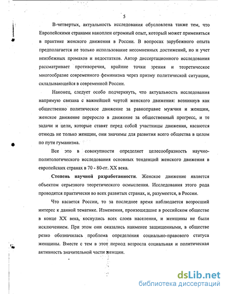 В-четвертых, актуальность исследования обусловлена также тем, что Европейскими странами накоплен огромный опыт, который может применяться в практике женского движения в России. В вопросах зарубежного опыта предполагается не только использование несомненных достижений, но и учет неизбежных промахов и недостатков. Автор диссертационного исследования рассматривает противоречия, крайние точки зрения и теоретическое многообразие современного феминизма через призму политической ситуации, складывающейся в современной России.