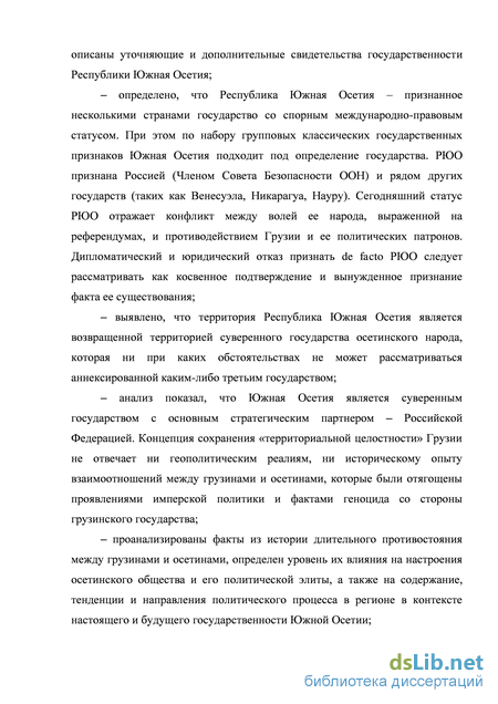 Фактический статус Республики Южная Осетия позволяет определить ее и как «государство», так же к ней применимо и понятие «государственности», когда особое положение РЮО может быть альтернативной формой традиционного государства со всеми его известными атрибутами. Рассматривая подобные РЮО государственные образования, М.В. Ильин полагает, что «за привычными для нас словами государство (the state etc.), а тем более государственность (statehood, stateness etc.) скрывается не одно ясно концептуализируемое явление или предмет изучения, а целый набор разнородных явлений и предметов, выражаясь образно – существа разных видов и пород»50.
