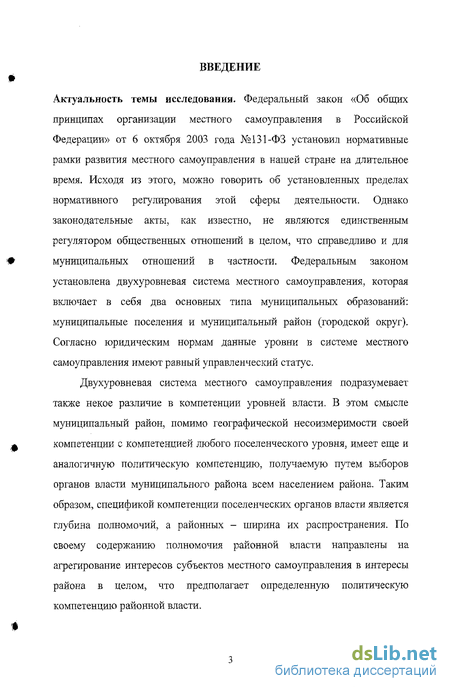 Актуальность темы исследования. Федеральный закон «Об общих принципах организации местного самоуправления в Российской Федерации» от 6 октября 2003 года №131-Ф3 установил нормативные рамки развития местного самоуправления в нашей стране на длительное время. Исходя из этого, можно говорить об установленных пределах нормативного регулирования этой сферы деятельности. Однако законодательные акты, как известно, не являются единственным регулятором общественных отношений в целом, что справедливо и для муниципальных отношений в частности. Федеральным законом установлена двухуровневая система местного самоуправления, которая включает в себя два основных типа муниципальных образований: муниципальные поселения и муниципальный район (городской округ). Согласно юридическим нормам данные уровни в системе местного самоуправления имеют равный управленческий статус.
