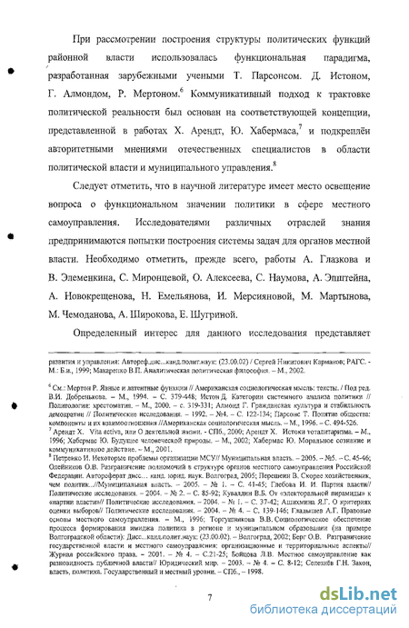 При рассмотрении построения структуры политических функций районной власти использовалась функциональная парадигма, разработанная зарубежными учеными Т. Парсонсом. Д. Истоном, Г. Алмондом, Р. Мертоном. Коммуникативный подход к трактовке политической реальности был основан на соответствующей концепции, представленной в работах X. Арендт, Ю. Хабермаса,7 и подкреплён авторитетными мнениями отечественных специалистов в области политической власти и муниципального управления.