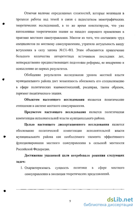 Целью настоящего диссертационного исследования является обоснование политической компетенции исполнительной власти муниципального района как необходимого элемента эффективного функционирования местного самоуправления в сельской местности Российской Федерации.