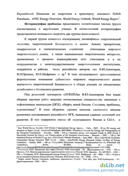 Вопросы энергетического сотрудничества России и ЕС нашли отражение и в ряде диссертационных работ по политическим, юридическим и историческим наукам, в которых рассматривались различные аспекты энергетической политики и геополитики21.