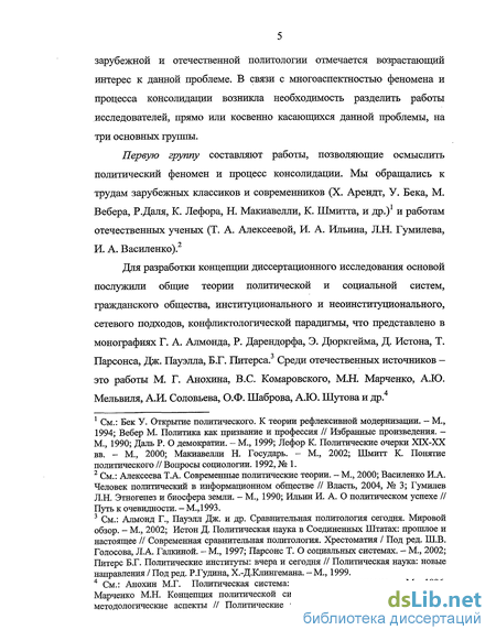 Первую группу составляют работы, позволяющие осмыслить политический феномен и процесс консолидации. Мы обращались к трудам зарубежных классиков и современников (X. Арендт, У. Бека, М. Вебера, Р.Даля, К. Лефора, Н. Макиавелли, К. Шмитта, и др.)1 и работам отечественных ученых (Т. А. Алексеевой, И. А. Ильина, Л.Н. Гумилева, И. А. Василенко).2