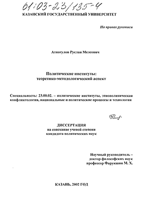 Атнагулов Руслан Мелсович. Политические институты: теоретико-методологический аспект : диссертация ... кандидата политических наук : 23.00.02.- Казань, 2002.- 188 с.: ил. РГБ ОД, 61 03-23/135-4