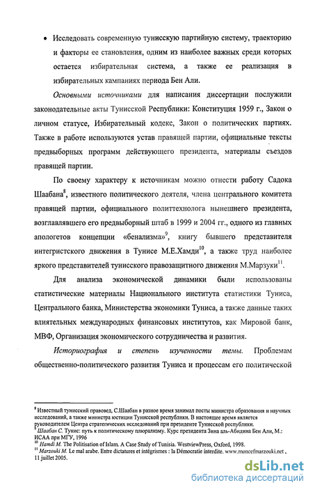 По своему характеру к источникам можно отнести работу Садока Шаабана8, известного политического деятеля, члена центрального комитета правящей партии, официального политтехнолога нынешнего президента, возглавлявшего его предвыборный штаб в 1999 и 2004 гг., одного из главных апологетов концепции «бенализма»9, книгу бывшего представителя интегристского движения в Тунисе МЕ.Хамди10, а также труд наиболее яркого представителей тунисского правозащитного движения М.Марзуки '.