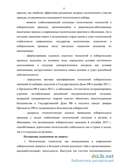 Научная новизна диссертационной работы заключается в актуальном анализе российского использования политических технологий избирательного процесса и может быть сформулирована следующим образом: - доказано, что политические технологии избирательного процесса состоят из двух уровней коммуникативных практик: первый уровень связан с агитационно-пропагандистским, а второй – с организационно-массовым направлениями политических технологий и обосновано, что в современном избирательном процессе наблюдается тренд, связанный с переориентаций усилий политических акторов с первого на второй уровень коммуникативных практик, как наиболее эффективно решающих вопросы политического участия граждан, их рационально-осознанного политического выбора; - выявлен стабилизационный потенциал политических технологий в избирательном процессе, заключающийся в рационально-обоснованном вовлечении граждан в современные политические практики и обосновано, что в ситуации появления новых и актуализации старых вызов и угроз политической стабильности современного государства политические технологии в избирательном процессе могут выступать элементом механизма их минимизации; - сформулирована сущность властных технологий в избирательном процессе, выделены их основные типы, определены условия легитимного использования в ситуации демократического контроля как условия минимизации деструктивного потенциала новых вызовов и угроз российской действительности; - определены векторы трансформации технологий избирательных кампаний по выборам депутатов в Государственную Думы РФ в декабре 2011 г. и Президента РФ 4 марта 2012 г. и обосновано, что они были детерминированы угрозами дестабилизации российский внутриполитической ситуации, вызванной неуверенностью «партии власти» обеспечить конституционное большинство в Государственной Думе РФ и получить мандат доверия Президенту РФ от подавляющего большинства избирателей; - раскрыты технологические аспекты проведения избирательных процедур с целью стабилизации политической ситуации в регионе и обосновано, что региональные избирательные кампании 8 сентября 2013 г. способствовали укреплению политической стабильности как в стране в целом, так и в отдельных ее регионах.
