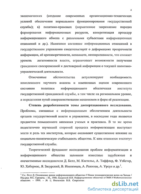 Степень разработанности темы диссертационного исследования. Проблемы, связанные с информационным обеспечением деятельности органов государственной власти и управления, в последние годы являются предметом повышенного внимания ученых и практиков. В то же время недостаточно изученной стороной процесса информатизации выступает место и роль тех институтов, которые оказывают существенное влияние на социально-политическую стабильность общества. К ним относится институт государственной службы.