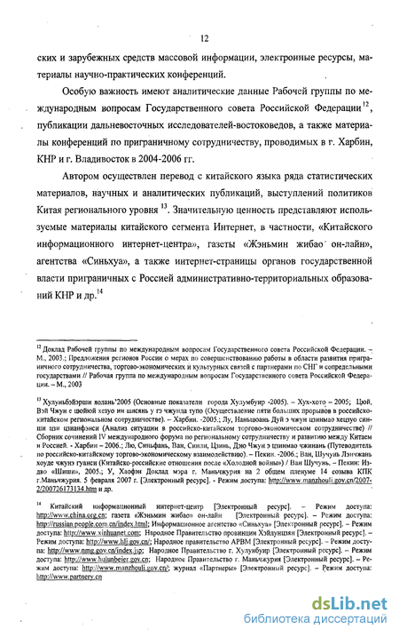 Автором осуществлен перевод с китайского языка ряда статистических материалов, научных и аналитических публикаций, выступлений политиков Китая регионального уровня 13. Значительную ценность представляют используемые материалы китайского сегмента Интернет, в частности, «Китайского информационного интернет-центра», газеты «Жэньмин жибао' он-лайн», агентства «Синьхуа», а также интернет-страницы органов государственной власти приграничных с Россией административно-территориальных образований КНР и др.14