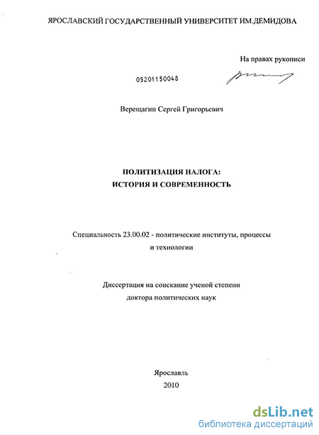 Степень научной разработанности темы. Поставленная в диссертации проблема до настоящего времени целенаправленно не исследовалась. Ранее сущность налога в своих работах пытались раскрыть юристы и экономисты, но политическая сущность налога предметом исследования политологов и социологов не стала.