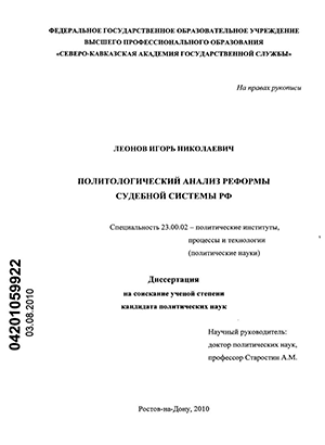Изучался опыт проведения судебной реформы во времена СССР. Реформа судебной системы осуществляется не только в России, но и в странах Европы, в частности изучалась практика функционирования европейских общественных и международных организаций, как, например, Европейский суда по правам человека и ОБСЕ. Политолог А.Г. Диденко справедливо называет одной из причин правового скептицизма частые и необоснованные перемены юридического климата. Вместе с тем политические особенности осуществления реформы судебной системы современной России выпали из сферы исследований, что и обусловило необходимость написания настоящей диссертации.